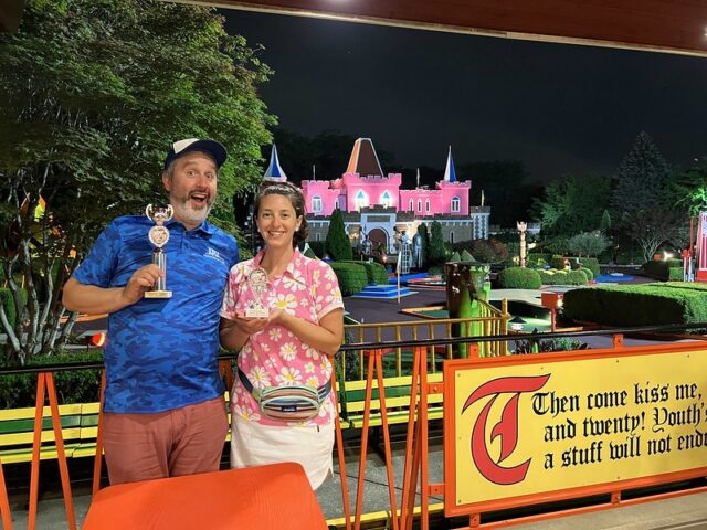 In our desire to compete with friends in the northeast of the US and to play some of our “bucket list” courses, we headed out to Connecticut to play in the Odetah Mini Golf Classic. This tournament had previously been on hiatus and had been run by the operator of the fantastic mini golf tournament resource The Squeaky Bagel and new putting pal, Gary Shiff. Friends and familiar names from the area were playing and they helped us dial in our putts with minimal practice. The Pink Putter took home the top amateur prize and I tied for the cash prize for the aces-only round.