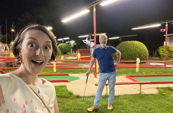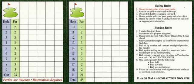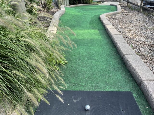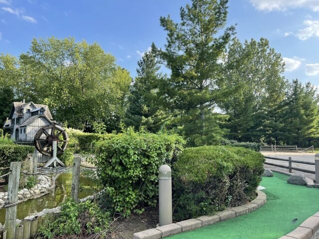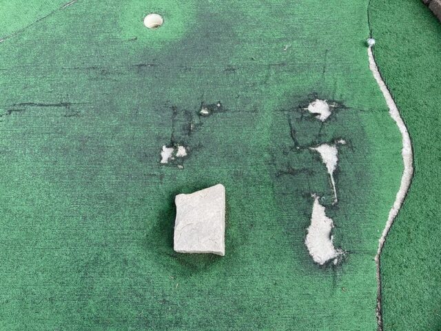 This tucked-away course next to a driving range looked charming from afar with a waterwheel house, bridges, and water features. Sadly, when I stepped onto the course, I found out why it was empty that day. The worn-down condition of the turf was immediately obvious. It’s a common thing we come across and when it is this worn down, the ball has a mind of its own. Even worse, many holes have massive gouges and tears throughout the turf. It’s clear they tried to do some damage control with some different grades of turf but not only did it look bad but it didn’t play much better. Our mini golf fantastic from the area, Mick Cullen, went back a year after me because he had heard from someone that the course was in better shape. Sadly, Mick confirmed that the condition was comparable to what I saw. I hope the owners of the course consider replacing the turf and doing some maintenance. The guts of an above-average course are there but I couldn’t recommend playing this course in its current condition when Par-King is right down the road.