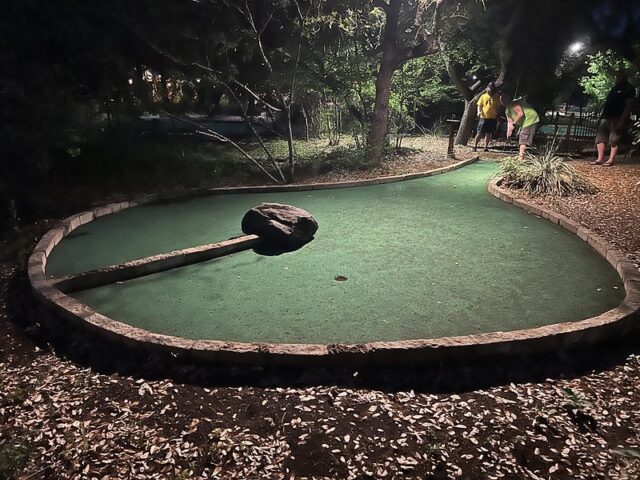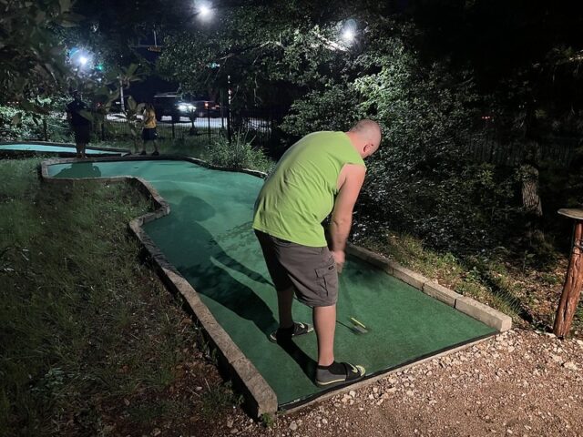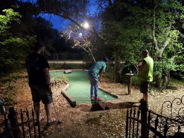 I really like the vibe of this place when we visited. The facility was charming with string lights in the trees, good tunes over the speakers, drinks, and a variety of activities including mini golf. We all had binged on mini golf the previous 2 days so the laid-back vibe was the right speed for us. The course itself was fairly straightforward with jagged concrete walls and green turf but the cup placement and design of some of the holes were really interesting. There was a specific hole with cut-out fish on top of a bridge that was a nice and challenging obstacle. The main issue with the course was the condition of the turf and maintenance. I can’t imagine how difficult it was to maintain this course with all of the trees surrounding the holes. Our crew enjoyed this course and had a lovely evening but sadly, this venue closed and has become an event rental facility for a wedding company. It seems unlikely but I hope the owners of the property rehab the course as it would be a wonderful amenity for guests at any wedding.