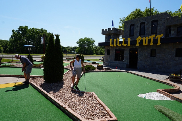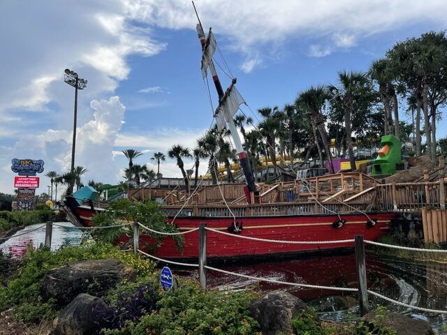 From our quick assessment, the courses appeared to surround an impressive central water feature with a large pirate ship. The turf looked to be a bit worn down with some debris on the greens. There were a lot of steps, so these courses are most likely not ADA accessible.