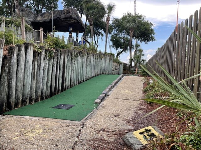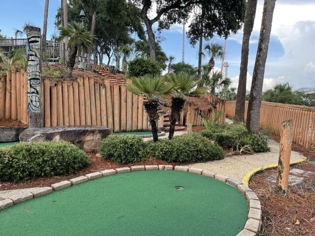 Back in June 2021, we took a long weekend trip to the panhandle of Florida the celebrate my birthday and play lots of mini golf. It turns out that within the area of Pensacola, Destin, Fort Walton Beach and Panama City Beach there are just too many courses to play in one weekend, so we had to settle with some quick visits to courses without actually playing them. That brings us to Tropical Mini Golf at Big Kahuna’s Water & Adventure Park. The entire park is owned by the Boomer’s chain (we’ve played Boomer’s courses in Boca Raton, FL and San Diego, CA) and in this case, the mini golf (three 18-hole courses) is part of the “Adventure Park” along with a Sky Coaster.