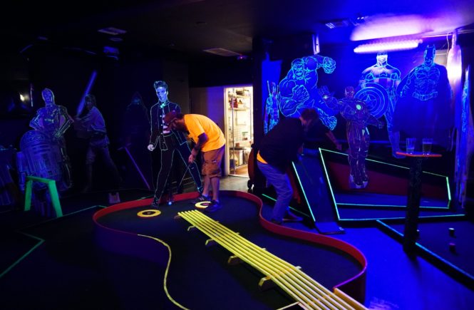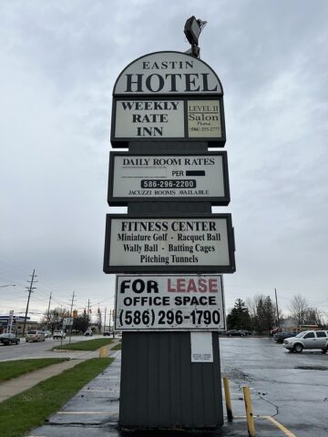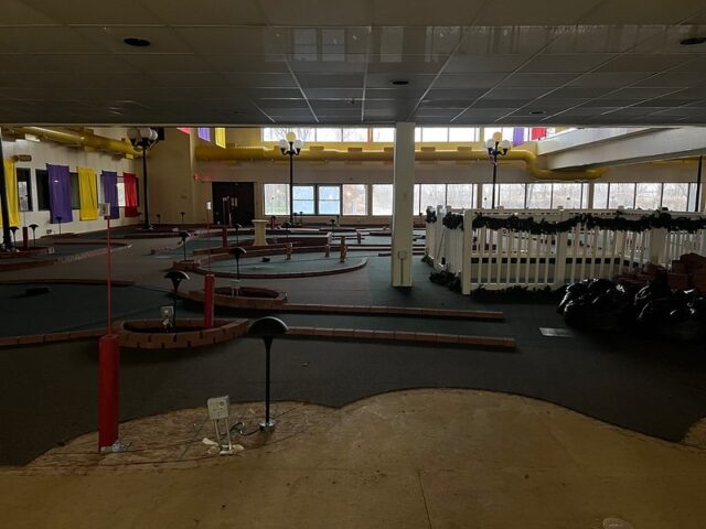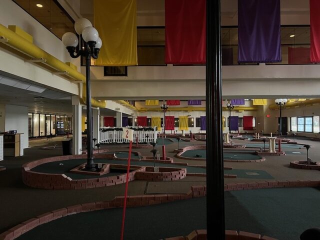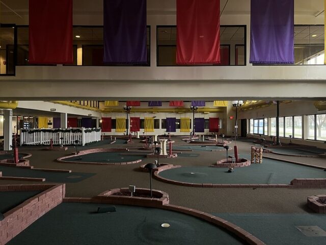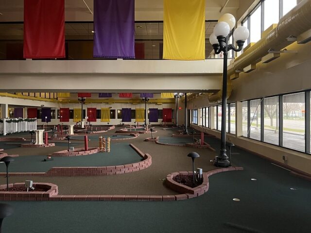 In April 2022, we were in the Detroit, MI area to do a shop/site visit for our work on Cranbrook on the Green. In our down time, we travelled slightly north and east of Detroit to the nearby Gratiot/Roseville to play a course we had found. While at a traffic light, we looked over and saw a sign for the Eastin Hotel with the words “Miniature Golf” and naturally, we couldn’t resist. Our curiosity led us through the doors of a seemingly defunct Fitness Center (maybe due to COVID) that is/was part of what is now a Quailty Inn. We made a left turn and headed down a quiet hall to the windows of this mini golf gem.