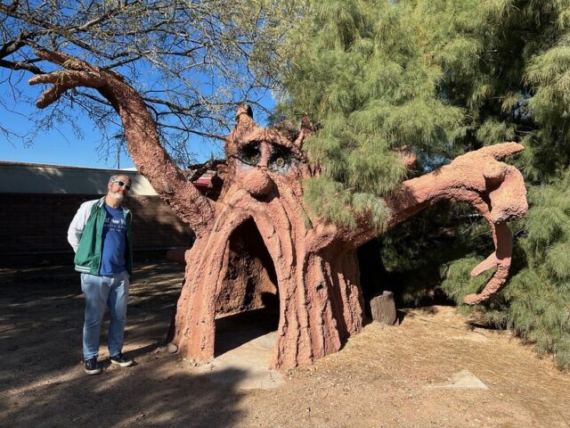 Stop 1- the original sign, located on West Drachman Street, just north of Pima Community CollegeStop 2, the Monkey, located in the yard of a private home at 727 N. 9th Ave.Stop 3 – the Easter Island head, now located at The Hut Tucson, 305 North 4th Ave.Stop 4 – Valley of the Moon on 2544 East Allen Road which is home to multiple statues including the Stump pictured hereThe Pygmy Hut, also at Valley of the MoonThe Castle, another one located at Valley of the MoonThe Spider Tree, the fourth statue located at Valley of the Moon