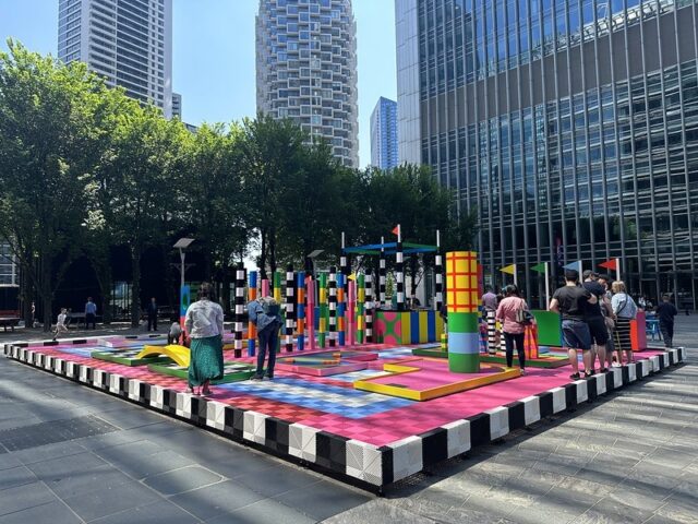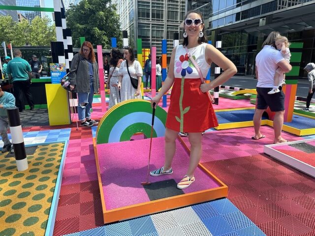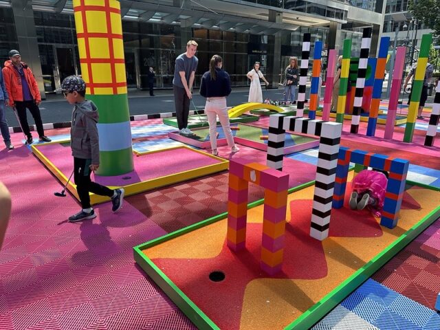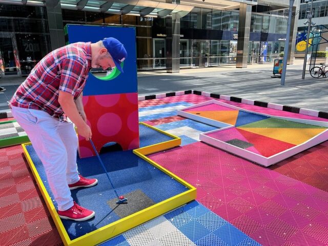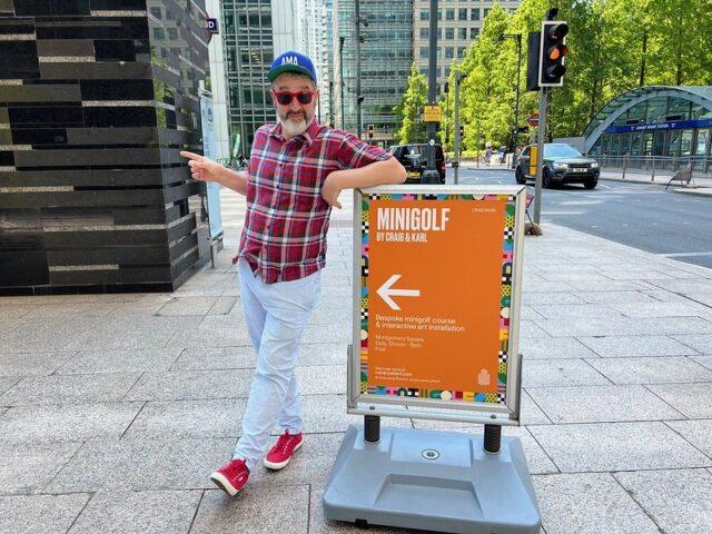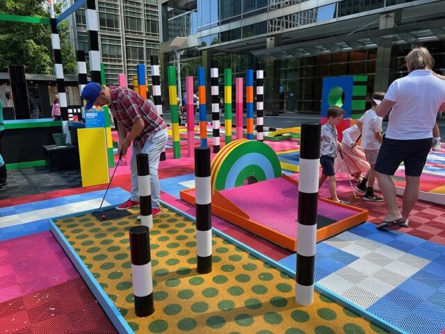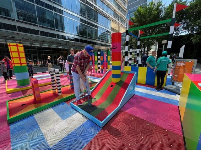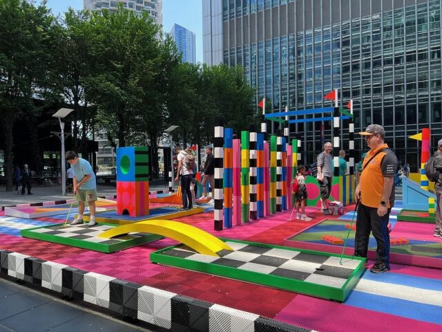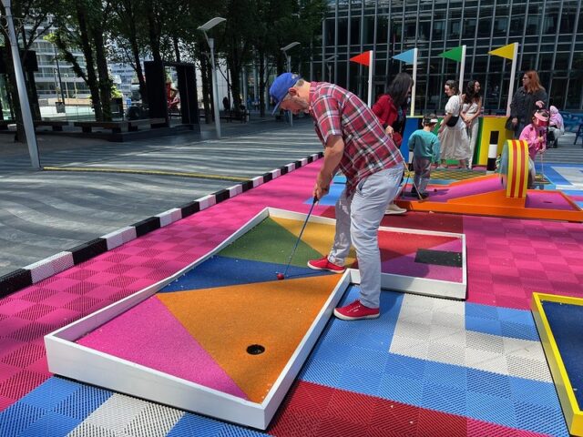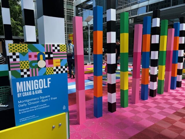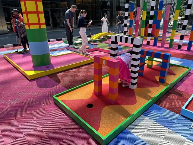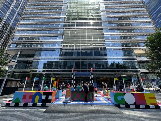 Ever since we saw articles about this pop-up course designed by artist duo Craig & Karl back in early 2022, we added it to our “must play” bucket list. I’m happy to report that in June 2023, we finally made it across the pond and got a chance to visit and play this mini golf experience at Canary Wharf in London.