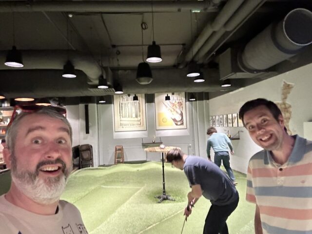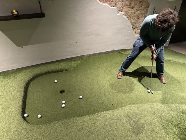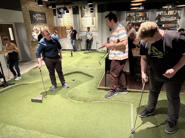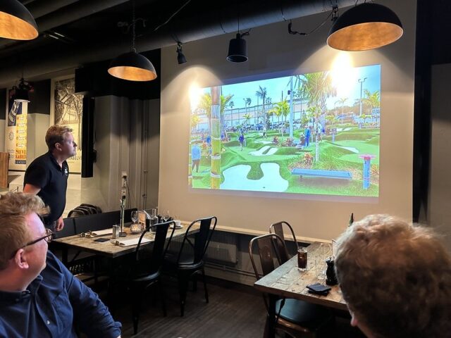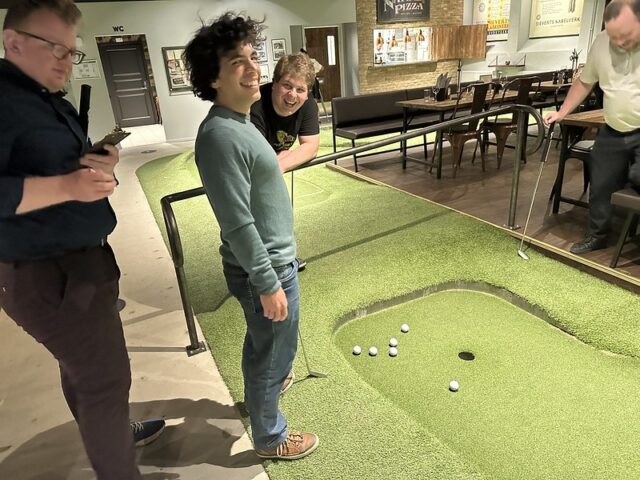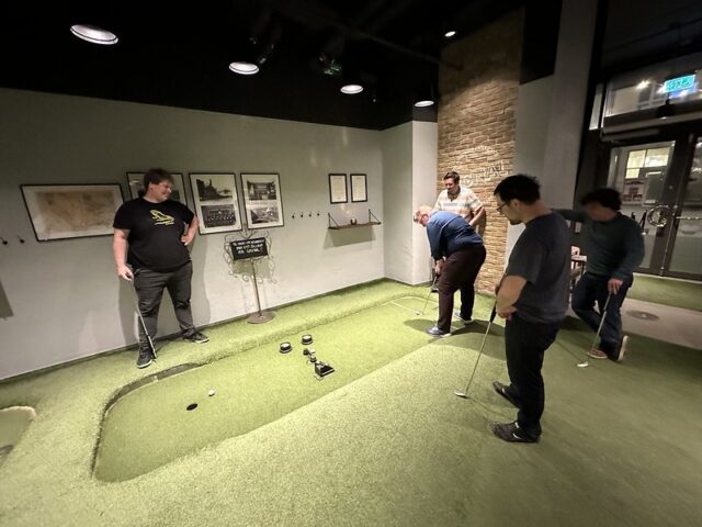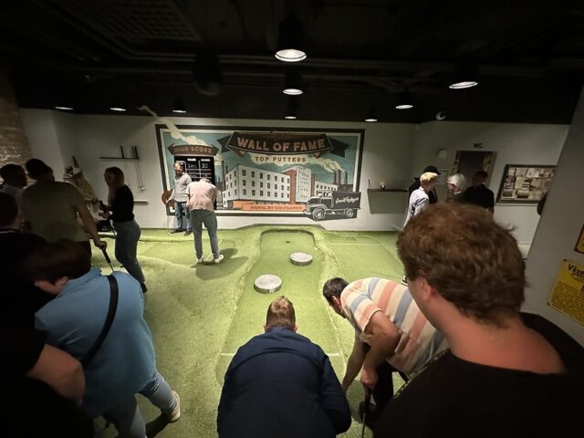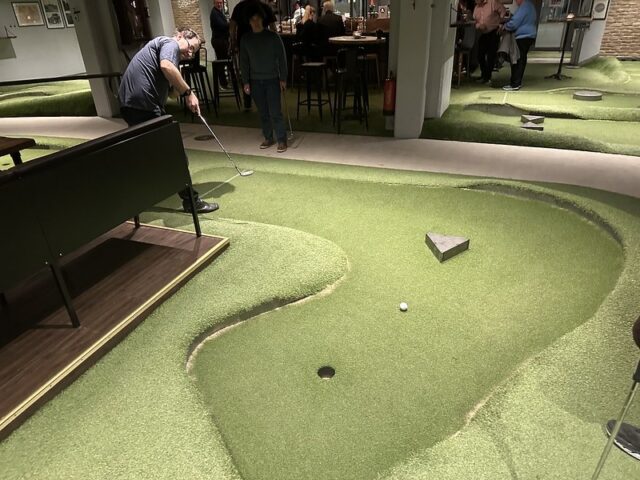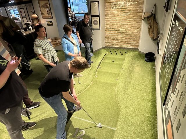 There are some mini golf experiences that are special because of the course and others due to the wonderful company you share a round with. I can firmly say that my experience playing at Signal by Golfbaren was due to both the people and the fun 12-hole course. At this point in my trip to Sweden, I had already played a good number of courses built by Sweden-based CityGolf. All of the courses had a very clean and smart design with a mix of challenging and fun gameplay. This was the first time I got to see a fully operating Golfbaren course and all of the positives I had heard were well-founded. The course itself took the theme from the former factory space and businesses that inhabited the premises. Lots of simple metal shapes and on-theme obstacles dotted the undulating greens. The way the walls and playing areas were built into the floor helped with the overall integration of the mini golf into the bar and restaurant space. The focus of the space is definitely for an older audience looking to grab drinks and food along with their putting but unlike some other trendy chains popping up to serve adult social hangs, the game of mini golf is well-considered. This should come as no surprise as the man behind the suite of Golfbaren courses in the greater Stockholm area, Hans Olofsson, is one of the greatest mini golfers of all time. It’s clear in the design of the whole space that he’s eager to share both the fun and history of the game with people who venture into Golfbaren. I could go on and on about this course and all the other Golfbaren courses and will in future reviews but I’d be remiss not to focus on the company I shared rounds with at Signal on my visit. After only meeting Martyn, Marton, Vojta, Seve, Andrew, and Balázs a few days previously, I felt a deep kinship with these fellow mini golfers who came to Sweden from across the UK and Europe. This was on top of the wonderful hospitality shown to myself and our little crew by all of the top Swedish players especially the CityGolf Tour organizer, Eddie Söderlund, and Golfbaren owner Olofsson. Feels fitting to share this review during the Thanksgiving holiday weekend as I’m eternally grateful for the experience of playing this course with a ton of wonderful people.