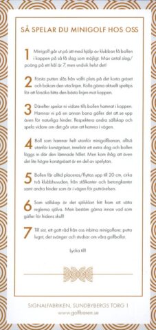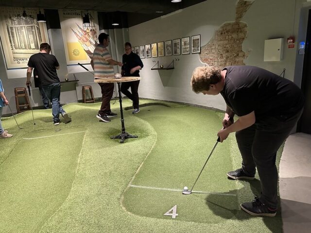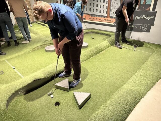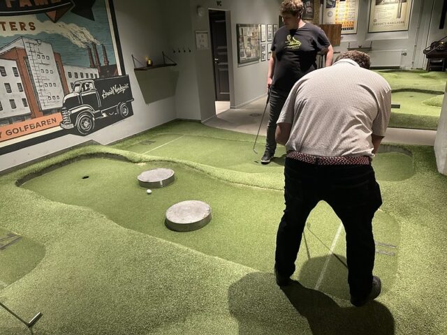 - From the website: “On the theme “Factory Chic”, Golfbaren Sundbyberg offers a really sharp mini-golf course on artificial grass in the old industrial building Signalfabriken in the center of Sundbyberg. Based on the history of Signalfabriken since the late 1800s with industrial activities such as Siverts Kabelverk, Järn-Alfa, LM Ericsson, but also the telegraph station and the Alpha Records of the 80s, we have designed a unique environment with inspiring storytelling.”