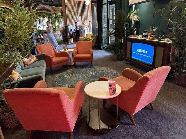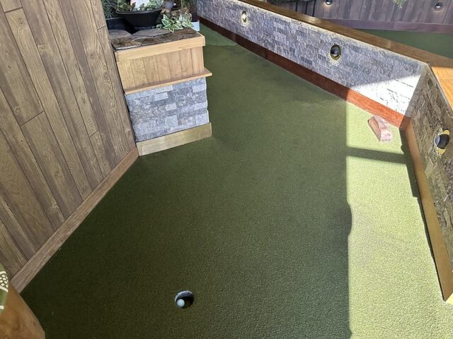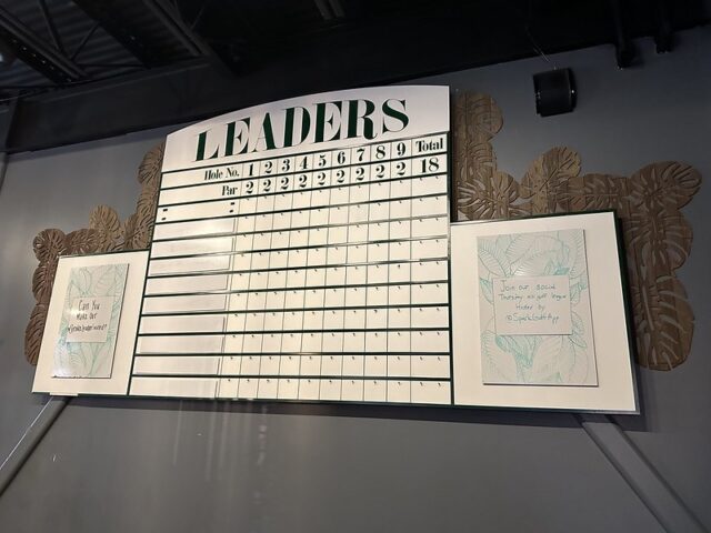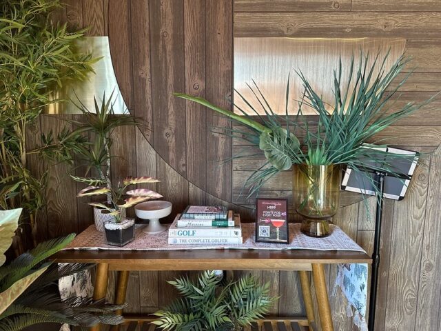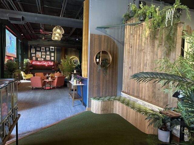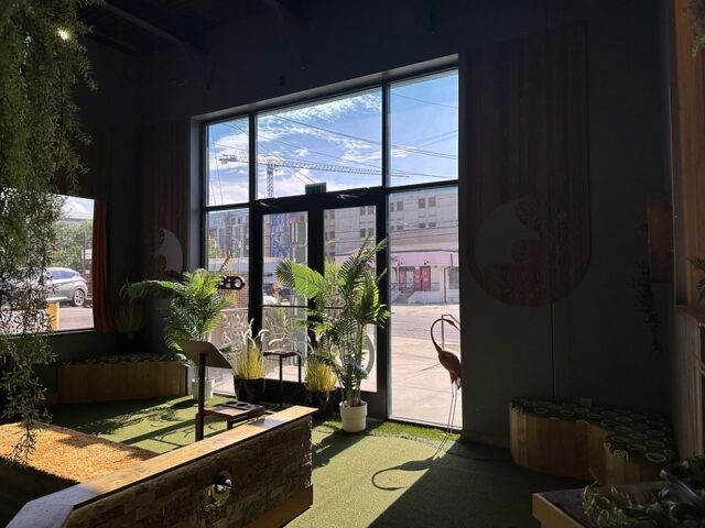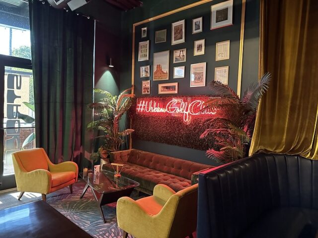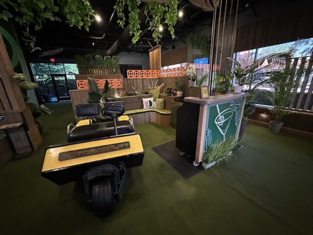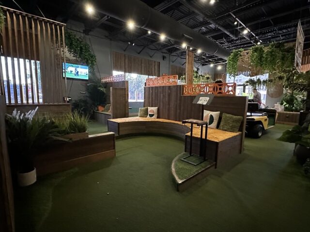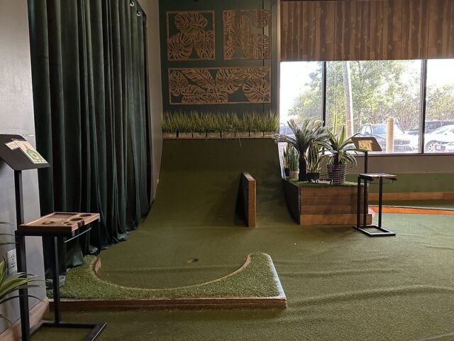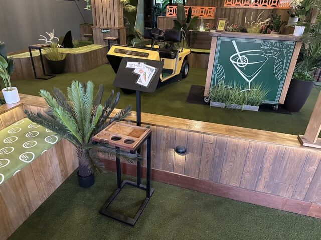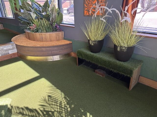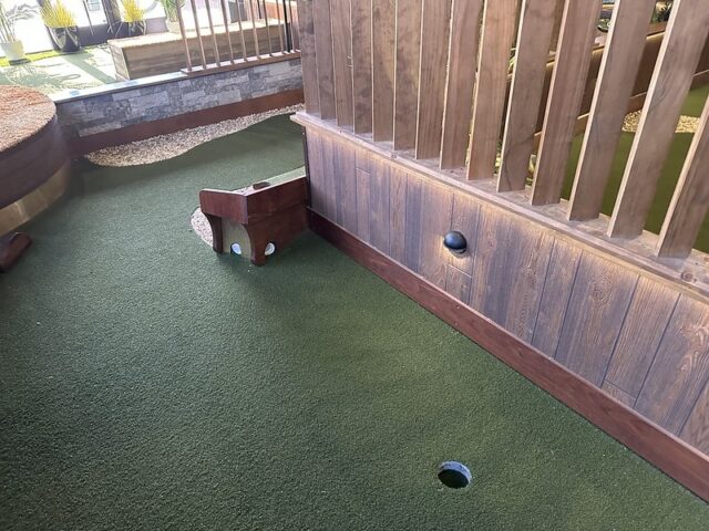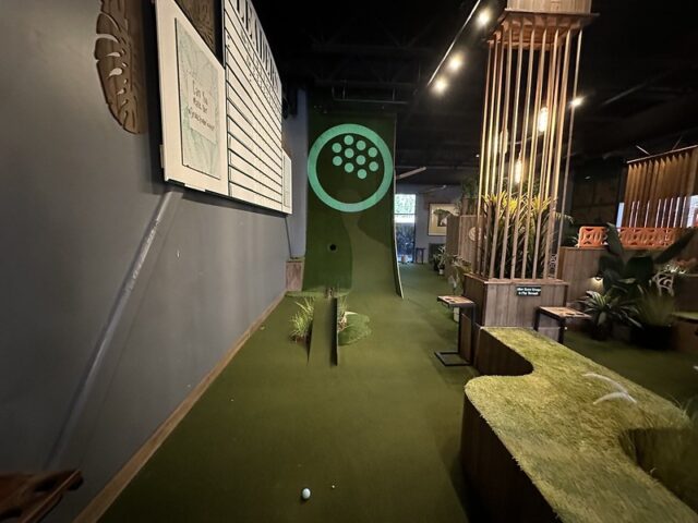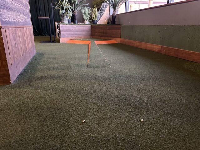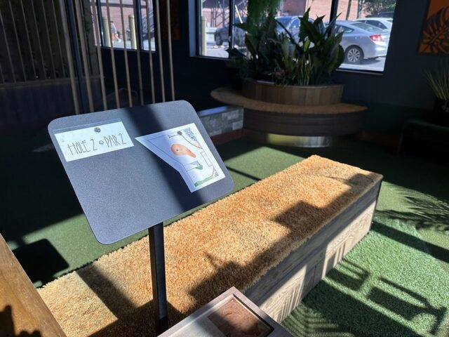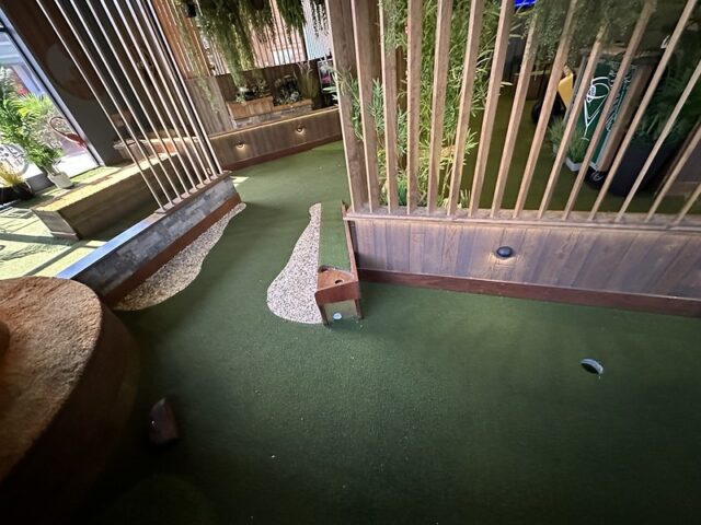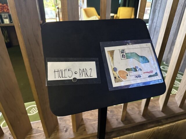 Prior to visiting the course, I had seen photos of Stroke Putt and it was quite clear that they executed the visual identity of the space and it looked like an incredible place to hang out for drinks. I was most curious about the 9-hole course itself as I know Scott intended to set the course up in a way that it was integrated into the overall vibe and atmosphere. The seating adjacent to the holes and mid-round golf cart bar setup are on the mark and look fantastic. The entire course is carpeted in turf with gold pins and well-made signs with drink holders designating each hole. The first two holes on the course are fairly straightforward with sharp-looking angled pieces of wood to help you land a hole-in-one. Nothing out of the ordinary but like any good course, they allow players to warm up before being seriously challenged. The next few holes provided a good mix of gameplay and risk/reward opportunities with a final skee-ball hole that is beautifully built and can swing the results of a game. While I liked that the whole course felt seamless with the turf floor, the one negative is that there were several places in the course where the turf was not tought unintentionally lumpy. You can see this in a few of the photos below and it definitely impacted the play on a few holes like #6. This is my only complaint aside from being greedy and wishing for more holes because I thought the whole space was well thought out. The furniture, choice of books on countertops, plants, signage, and bar room layout make it one of the best places to visit if you’re a fan of grabbing a drink and taking a few putts. If you’re a fan of mid-century modern style, then this is a must-visit as it is the only course that has truly nailed this style.