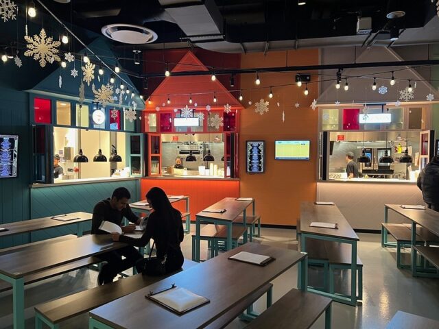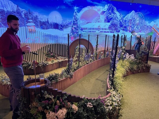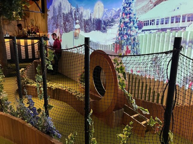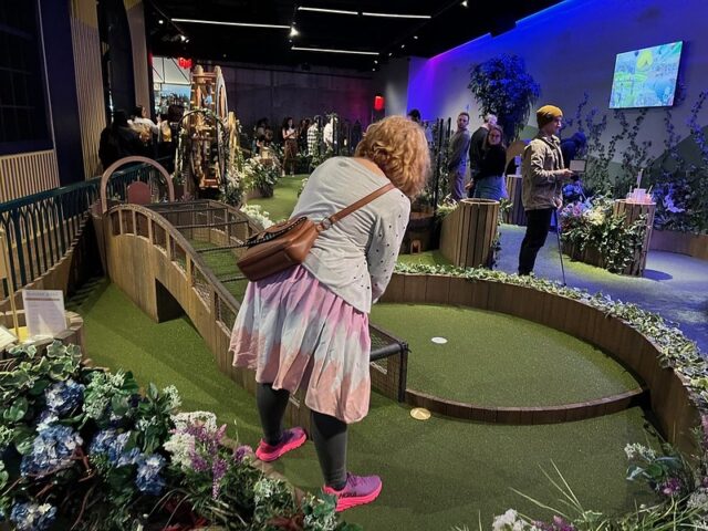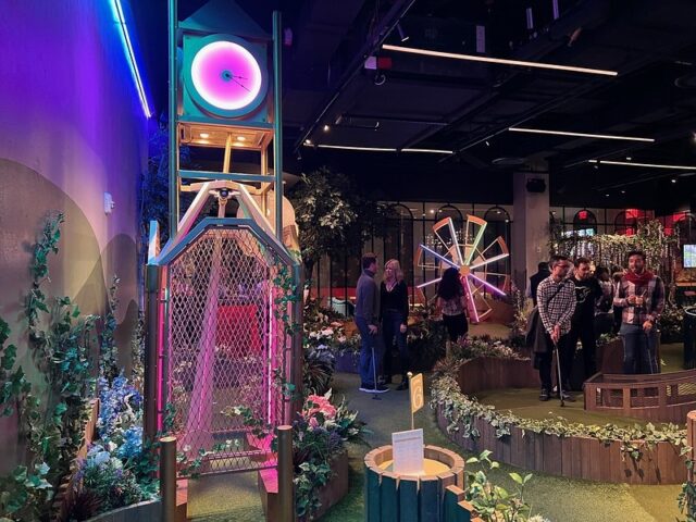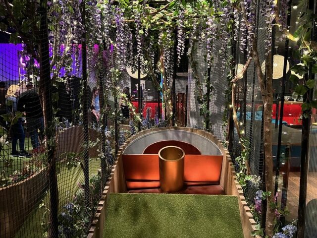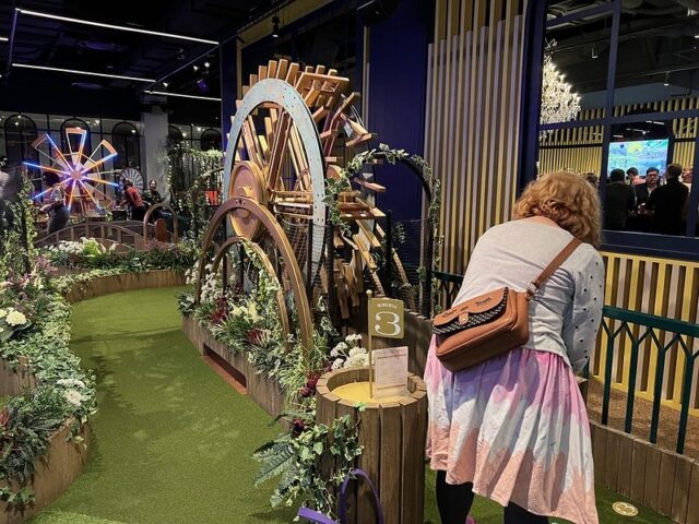The location has three 9-hole courses. Two of them were open and the third was closed. The first course, the one closest to the entrance, had fun collage-style projected animations on the walls above the course, giving it an extra sense of place. The other two courses towards the back just had plain painted walls surrounding them. From what I could see, the three courses were essentially identical in hole design. The biggest difference (aside from the wall projections) was the order of the holes. Woven throughout all the courses were more hallways full of faux wisteria and a variety of well-themed bars and seating areas, plus a small food court.