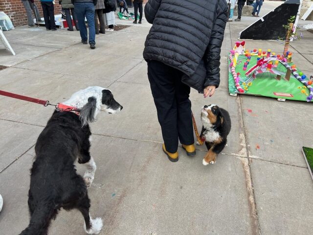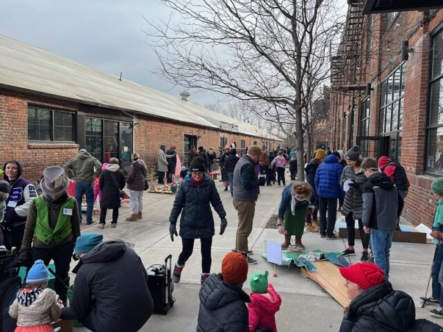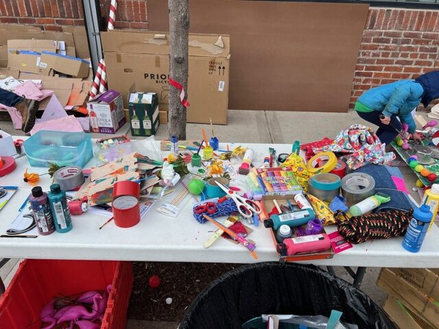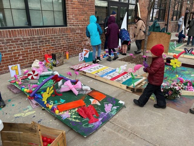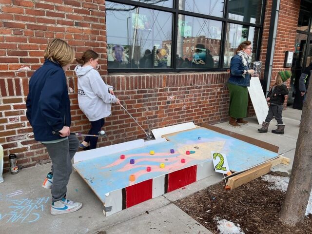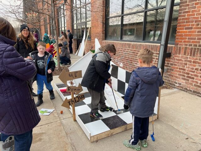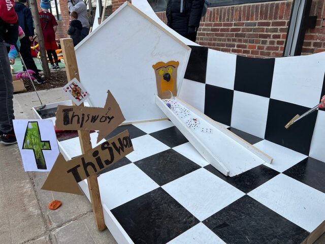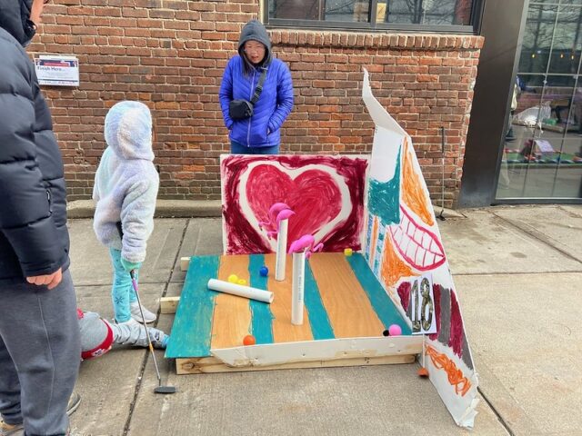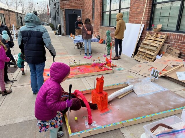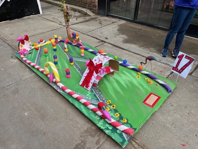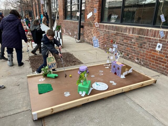 The premise was that there was an open build from 1-4pm where members of the community were invited to come and construct holes from provided materials like cardboard, pieces of gutter, tubes, wood, pallets, nails, screws, tape, and more. Then, from 4-6pm was open play. We got there right around 4 to a wildly busy course. And since we had our dog along with us, we decided to not play, but to just visit and document the project. There was a suggested donation of $15/person to play, with all proceeds supporting Young Dance. While we didn’t play, I can say that this Alice in Wonderland inspired course brought joy and smiles to the many, many who participated. Congrats to Young Dance for a hugely successful event, we love seeing kids getting involved with mini golf!