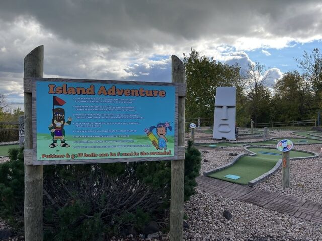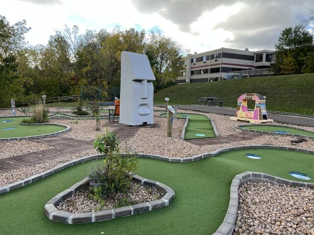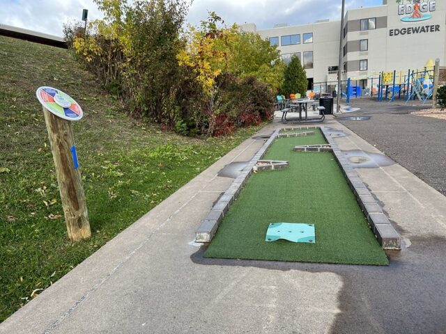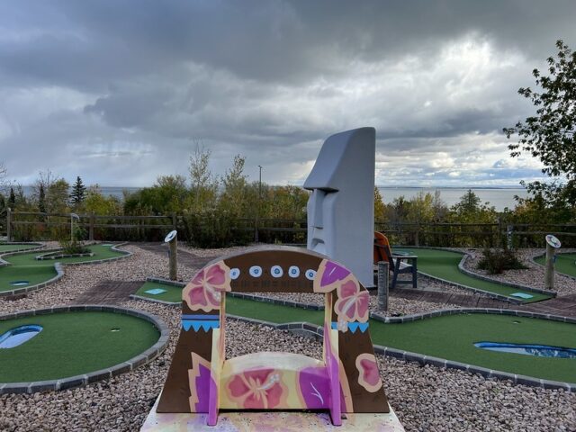 The hotel and course are located just before the start of Highway 61 which heads to the North Shore and was namechecked in the title of a legendary Bob Dylan record. The coruse itself overlooks looks the serene Lake Superior. The tiki theme doesn’t necessary fit the Duluth area but it does match up with some of themes of the larger hotel. The large tiki head and tiki styled version of the Duluth lift bridge give the course some nice flare. The simple but moderately challenging hole design that incorporates red bricking, green turf, undulations, volcano hole and water hazards makes this course better than one would expect as an amenity at a hotel. We’ve played very few hotel mini golf courses that are anything more than a standard putting green and this course is in better condition and plays better than a lot of courses we stumbled upon in our travels. The lovely view of the lake and combined with all of the other amentities makes this feel like a great hotel option to stay at. It does seem like the hotel caters to kids and families so I imagine during busy weekends these facilities are bustling with lots of activities and kids. I’d definitely consider staying at the Edgewater and would most definitely play numerous rounds on this course.