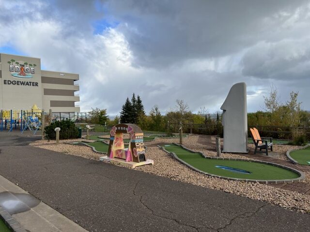 Fellow Minnesota mini golf aficionados Matt Tellander and Brandon Nocerini had shared photos of an outdoor course in Minnesota we had not previously seen with a large tiki head and some decent-looking gameplay. I reached out to the guys of Bro Mediocre (formerly MinigolfUS) to figure out where I could find this course. Much to my surprise, it was at Edgewater Hotel and located just north of downtown Duluth, Minnesota. We were headed Up North in the fall of 2022 to check out the sights and I put Edgewater down as a quick stop. We landed at the hotel on a slightly chilly day that included a little bit of snow earlier. When we arrived, the hotel immediately looked familiar. At some time in either my childhood or teen years, I had visited this hotel. I grabbed my putter and walked down the steps to the outdoor course to give it a whirl.