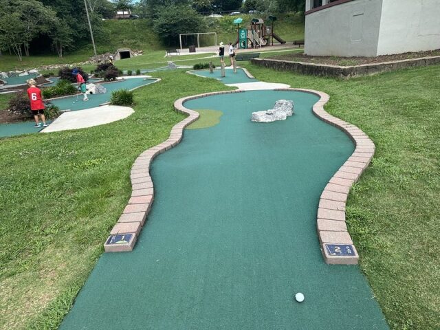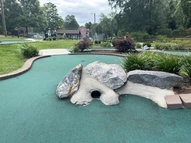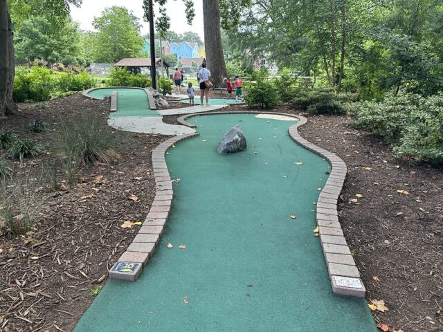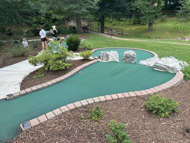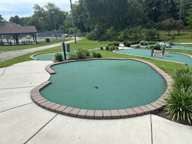 I’ve played numerous Harris Miniature Golf designed courses so I knew to expect red-bricking, green turf, and a handful of obstacles made of wood or rock. No surprises when I visited but I was impressed by the custom signage at the beginning of the course. The hole designs are fairly similar across all of the courses they built and they play fairly well for the public and consistently for those who like to play competitive mini golf. The course was in great condition considering it probably gets heavier abuse than most courses given it is unattended by staff and open for the public to play. I love that the course is free and open to the public but the cherry on the sundae is that the course additionally provides scorecards and pencils for the public visiting. I wish more cities and municipalities would follow this model and add simple but well-built mini golf courses alongside playgrounds, tennis courts, and baseball fields. It could provide an opportunity for the competitive sport to grow but ultimately, it gives a chance for people to experience one of the most inclusive games around. Visitors to the course will need to bring their own putters and balls as they are not provided on-site. My one suggestion is that the park provides some nearby options like used sporting goods stores for people to purchase putters and balls. Ultimately, I am a big fan of this course in that it provides a free mini golf option to the community at large. This is rare and I hope other park boards and cities following suit.