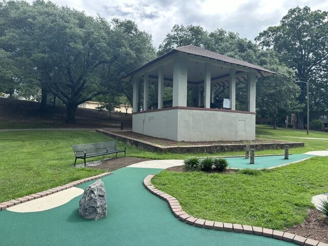 The Pink Putter and I played this course in 2015 while she was on an artist residency in nearby Spartanburg. We gave the previous version of the course a sandtrap rating because it was in serious disrepair even though it was free to play. When we saw the news in 2019 that the course would be rebuilt, we were glad to see that the city reinvested in this great asset to their oldest public park. On a swing through the southern US in July 2023, I revisited this park as it was only a mile from an intriguing indoor course, Group Therapy, that I was planning to play.
