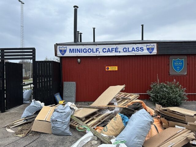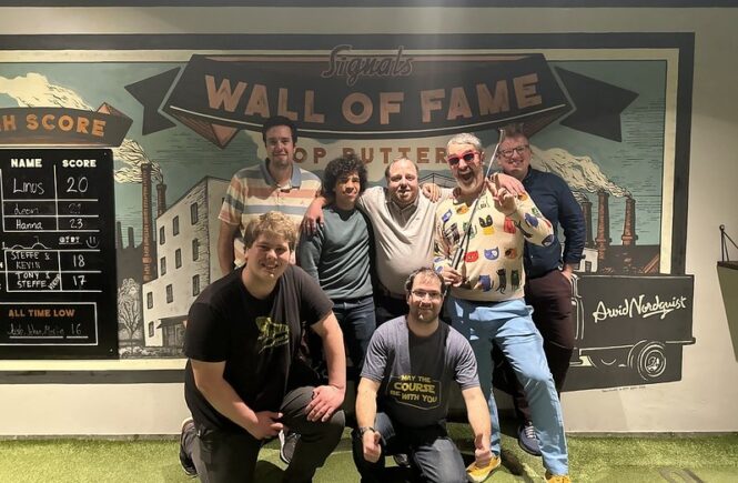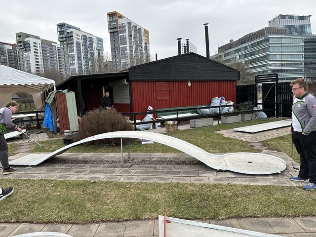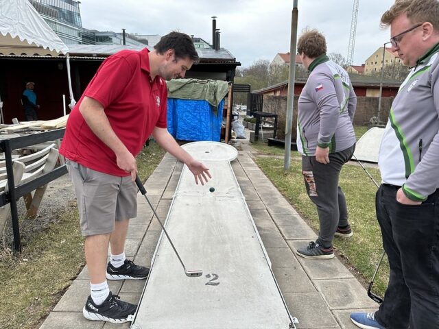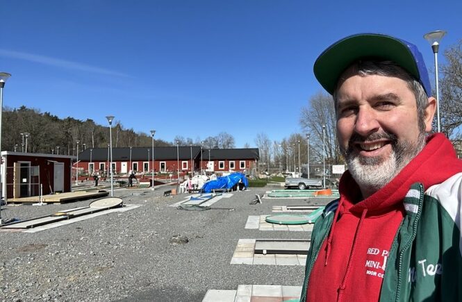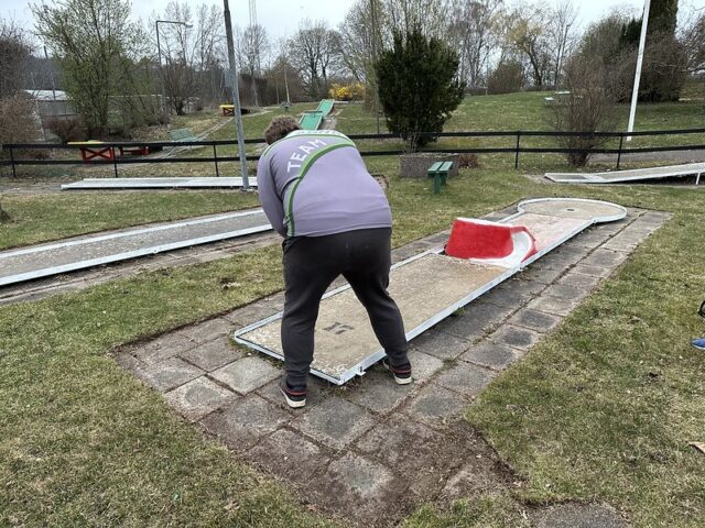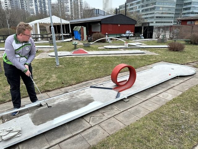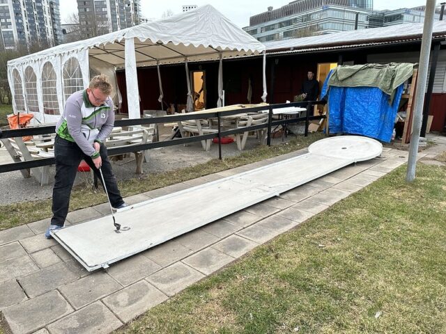 My travel companions in Sweden and I had just played a round of feltgolf at the Sundbyberg course with Swedish mini golf legend Ricard Lockner right after we all played the two-day CityGolf Tour tournament. Ricard saw that we were eager to discover and play as many courses as possible on our trip to the greater Stockholm area so he mentioned that there was yet another club not too far away. Of course there was! It felt like minigolf was everywhere I turned in Sweden. How could we resist something close by? Seve, Vojta, Andrew, and I jumped in our rental car and headed to the nearby Solna Bangolfklubb. The facilities were undergoing repairs and construction. The entrance to the area with the courses appeared open so we walked inside to explore. We happened to arrive when some of the club owners and staff were working on fixing the place up. We asked them kindly if we could play the courses as we weren’t sure when we would be back in Sweden again. Fortunately, we were given access to play with the caveat that we should understand that some of the lanes are either actively under repair and/or broken. With this knowledge, we took the limited amount of minigolf balls our crew had on hand and took a lap around the 18 competitive Eternit miniaturegolf lanes.