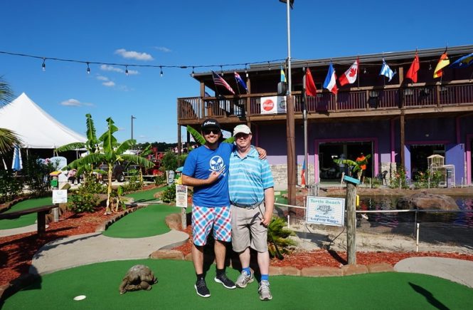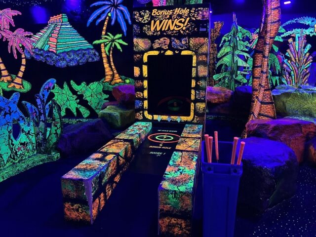 If you’ve read some of my previous reviews, you might know that indoor, black-light courses are not my favorite when it comes to mini golf. Often times I find them tacky, it’s hard to see and they sometimes give me a headache. Of the indoor “glow golf” courses we’ve played, I will say that Putting Edge was really well done. The 19 hole course was divided into multiple different themed rooms ranging from under the sea, to treasure, to medieval knights to a forest which kept things visually interesting. The decor was well done, as in everything was hand painted with lots and lots of texture and detail. The quality of this was better than most blacklight courses we’ve seen. The game play offered a nice variety of elevation changes and challenges such as bank shots, shoot throughs and narrow paths. Overall, this was a solid indoor course and a great option for winter or a rainy day.
