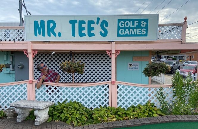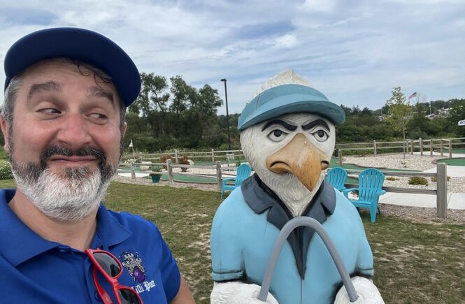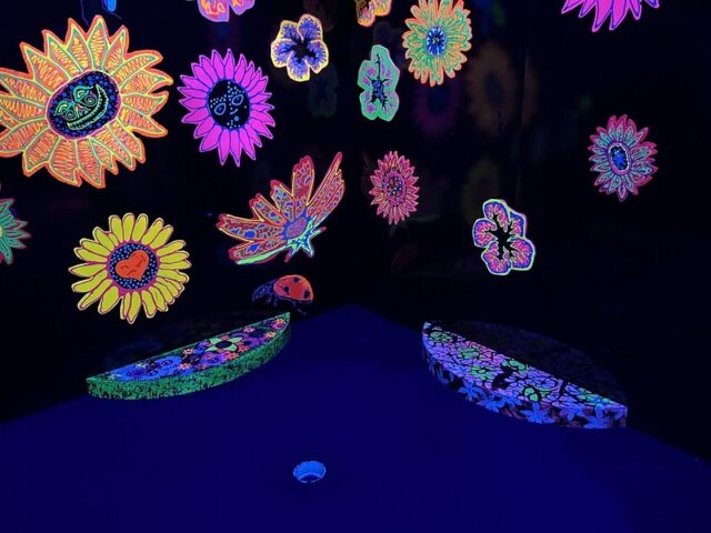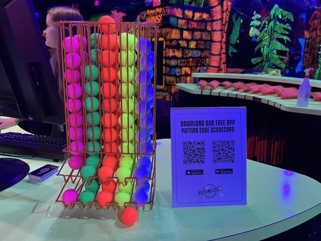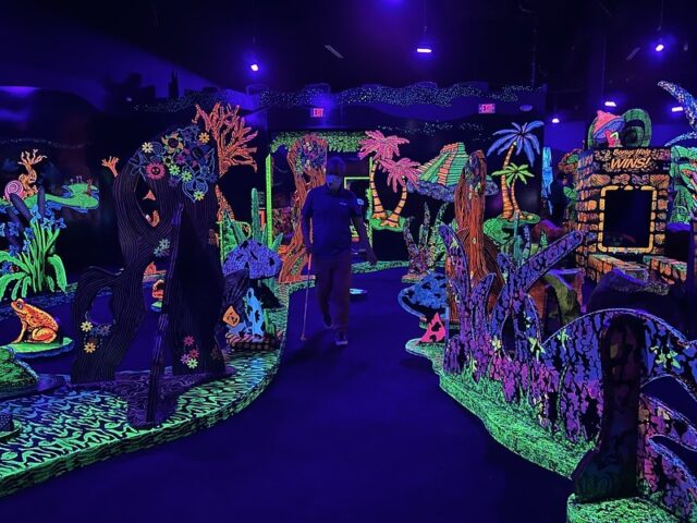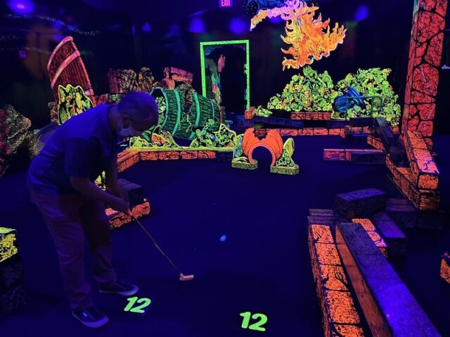 Back in spring of 2022, Mr. Tee and I were in the Detroit area to play the then newly installed Cranbrook on the Green, a course that we had designed for the Cranbrook Art Museum in Bloomfield Hills, MI. The day after the opening events, we sought out a nearby indoor blacklight course, Putting Edge in Novi. Putting Edge is a chain with multiple locations throughout Canada and three US locations including Ft. Lauderdale, Orlando and Novi. This is the first time we’ve played any of their courses.