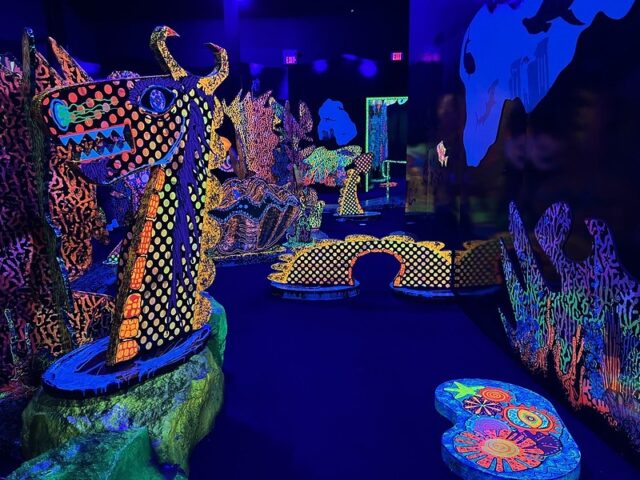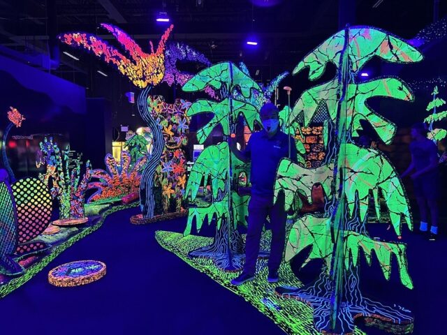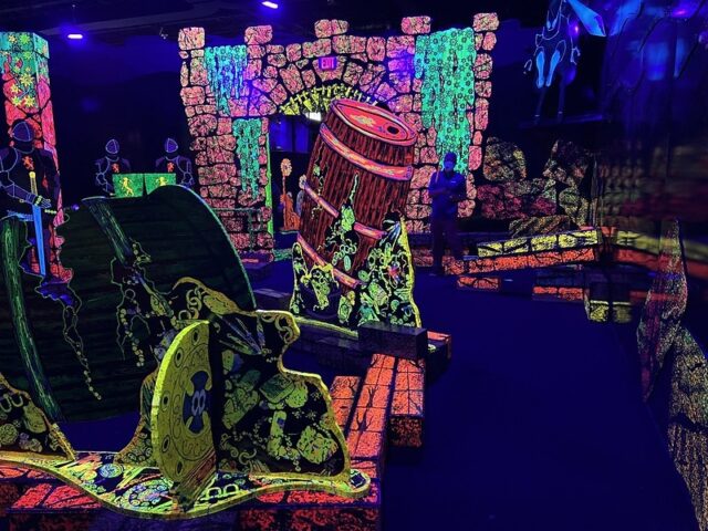 Well fabricated blacklight course with multiple themed rooms including forest, medieval knights, underwater and more