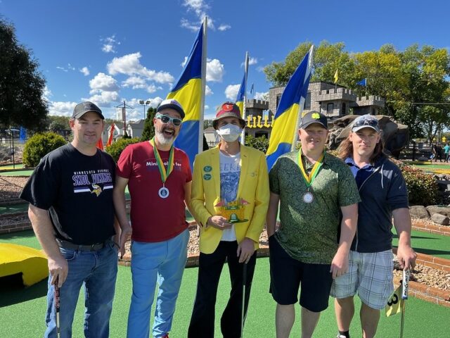The stage was set for greatness and it all came together on a Sunday morning/afternoon. With 8 qualifying scores of 53 or better, we saw the highest number of low scores on the course to date. The recently replaced turf and much-needed repairs didn’t hurt the cause but it was clear that the level of competition had gone up a notch. During the two rounds of the championship, there wasn’t a single round that was over par. While hole-in-ones continued to be rare and last year’s course record of 46 by Shawn Brown was not topped, we saw no rounds over par in the championship. In the end, we had a mini golf legend add to his legacy. After playing the course for the first time only days earlier, Mick Cullen turned in a 1st round of 50 and 2nd round of 48 to become the first non-Minnesotan to become the champ. Coming into the tournament, Mick needed to win first place outright to become the AMA season points winner and to finish ranked #1 in the country and he did it! This is the same year he set a world record of playing 4,941 mini golf holes in 24 hours.